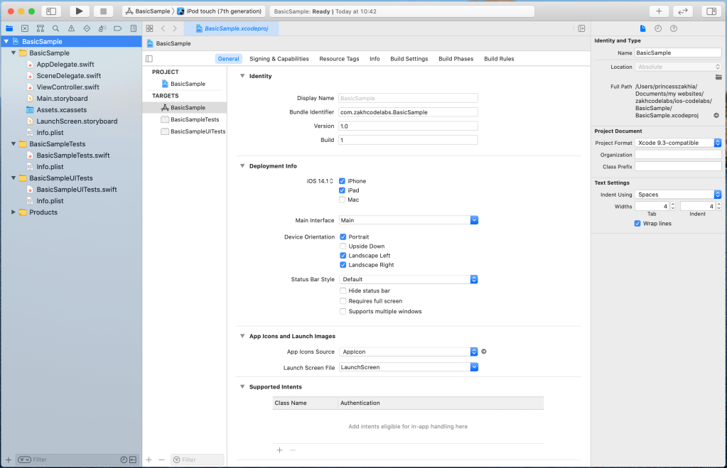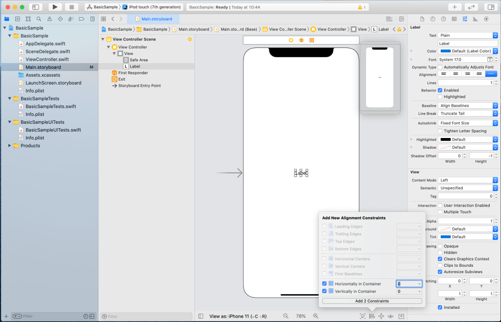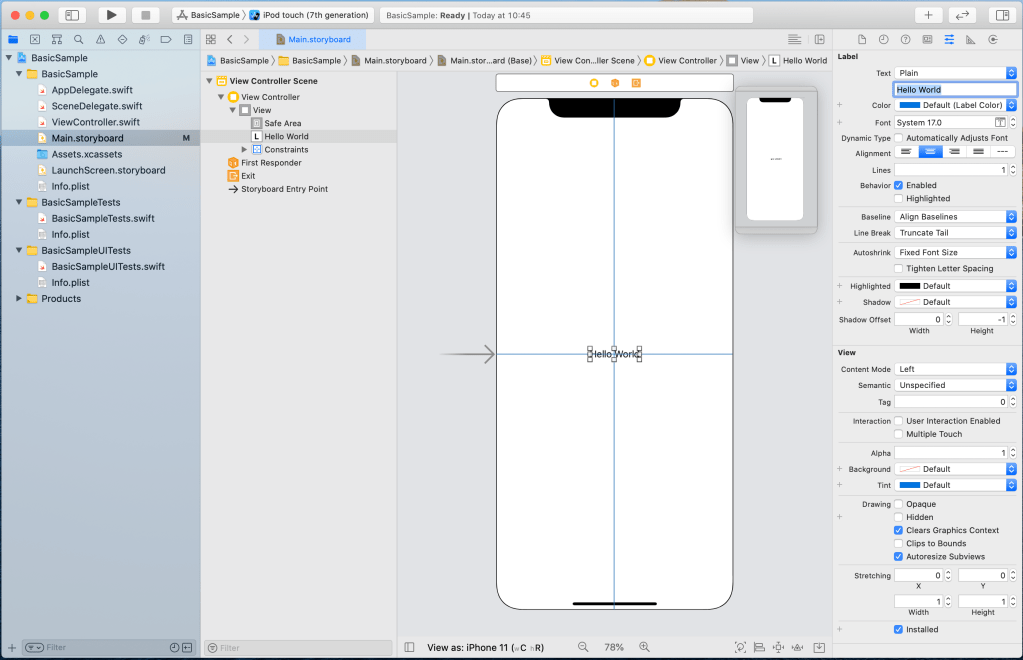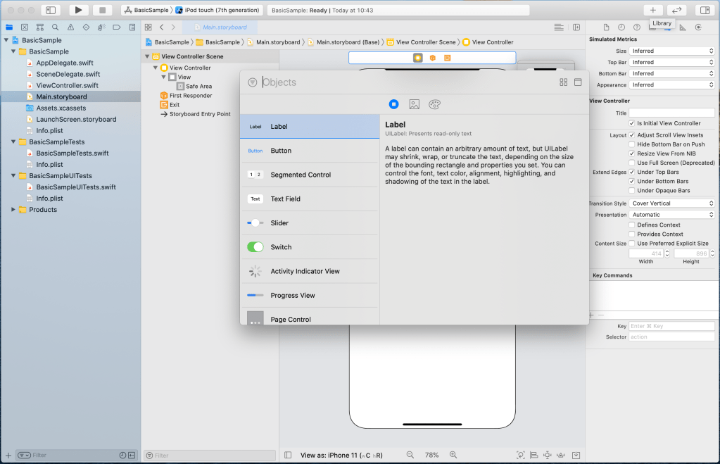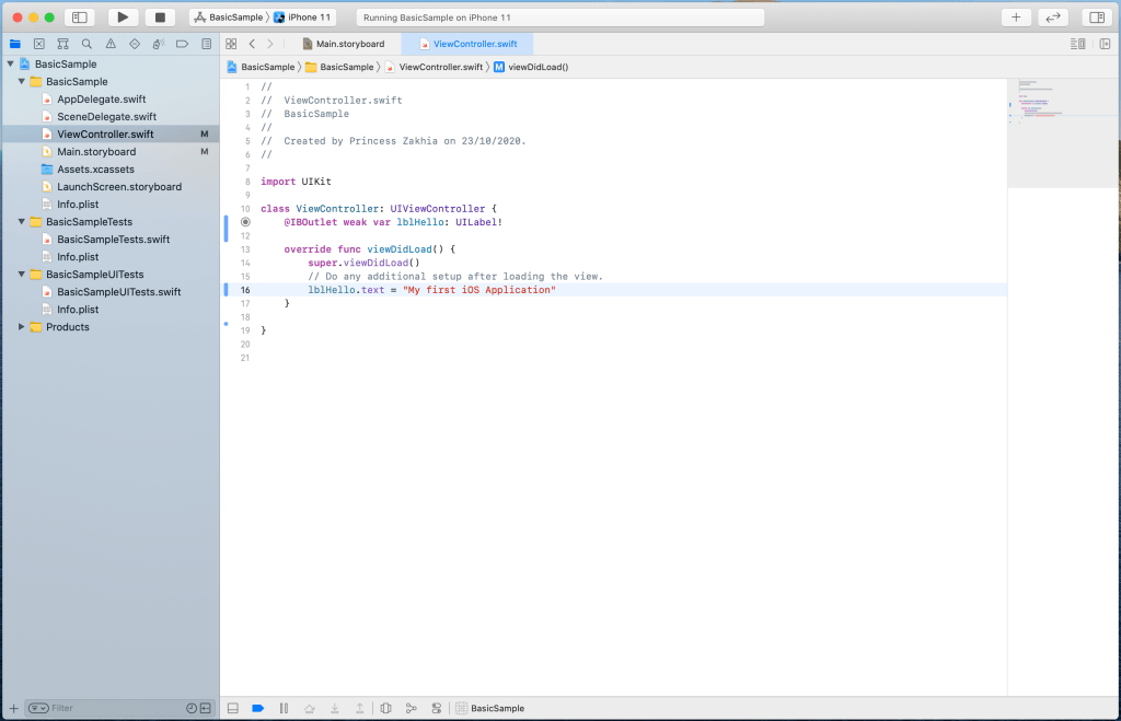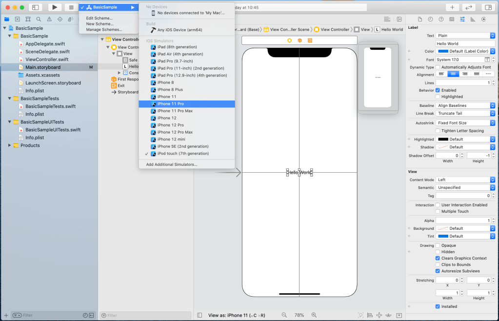 At the top left of Xcode, set an active scheme (toolbar) by clicking on BasicSample then select iPhone 11 Pro from the iOS Simulators. Then run the current scheme (toolbar) by clicking on the run button.