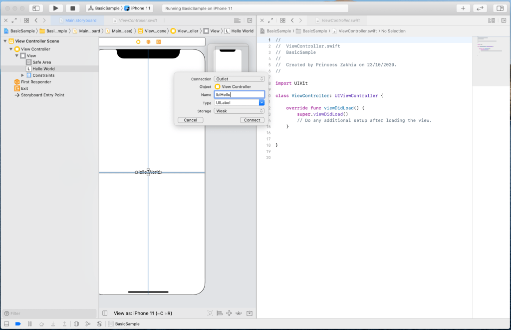 Our app is displaying the text we wrote in the design of our ViewControllerScene in Main.storyboard. We can change the text in our ViewController class file. To do so, we should connect the label in our ViewControllerScene to our ViewController class file. Make sure your editor is showing Main.storyboard, then add another editor on right and select the ViewController class file. Press the control button of your keyboard and drag the label from the ViewControllerScene to the ViewController class file, type the name lblHello and click Connect.