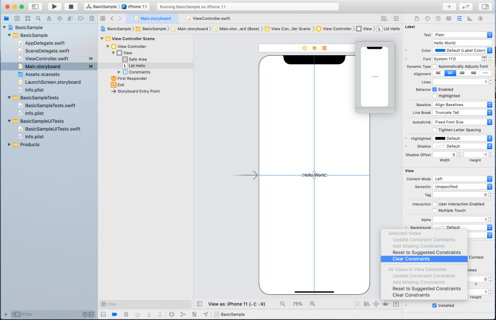 Now we want to change the text by clicking on a button. Let’s clear the constraints of our label first.