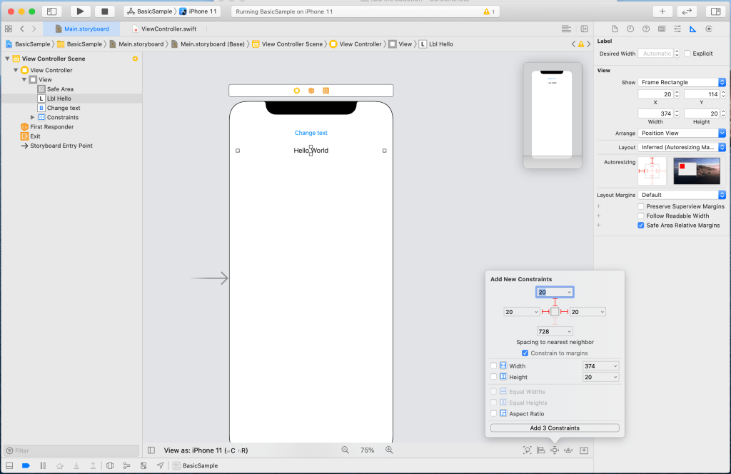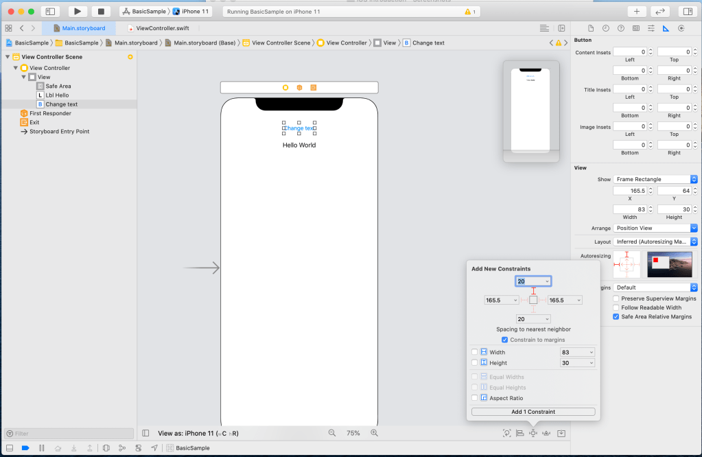 Let’s add a button on top of the screen and drag the label below it. Then select the button and add new constraints.