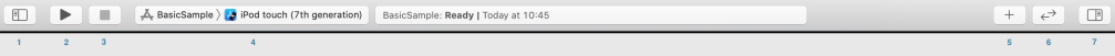 The Xcode IDE comprises of a toolbar (top), a navigator area (left), an editor area (middle) and an inspector area (right). The toolbar of Xcode comprises of 7 components.