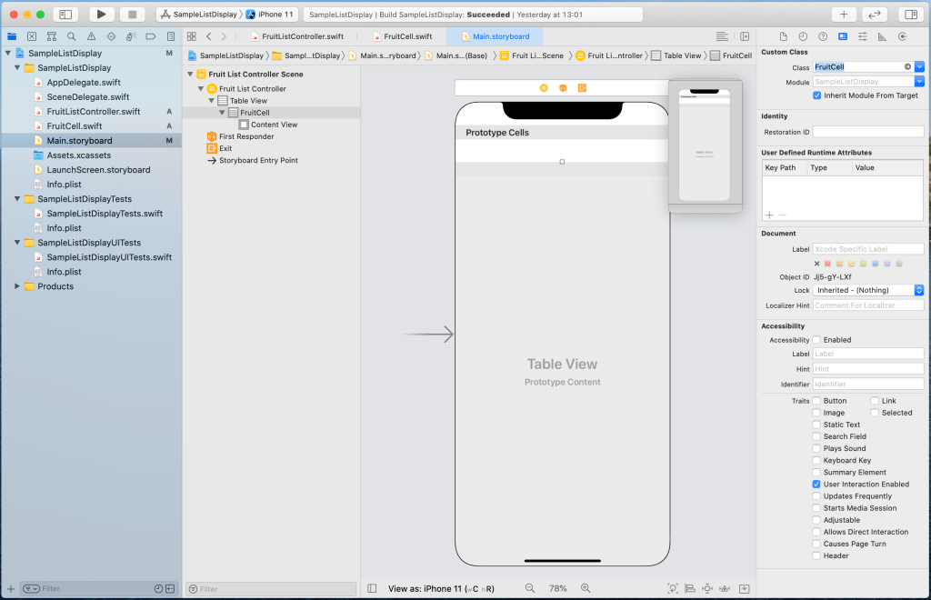 Now select Main.storyboard and then the FruitCell found under the TableView of the FruitListController in the editor. Once you’ve selected FruitCell, select the Identity Inspector in the Inspector area then select FruitCell as the class.