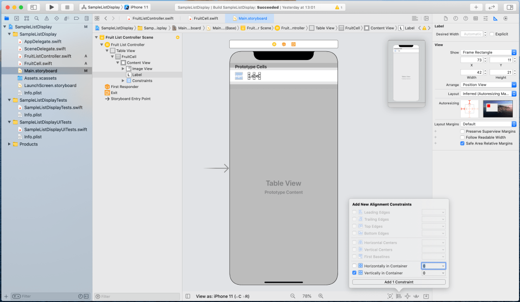 Let’s add some constraints to our UILabel. Click on the Align in the bottom of the editor area, check the Vertically in Container and then click on Add 1 Constraint. This will keep the UILabel centred vertically in the FruitCell.