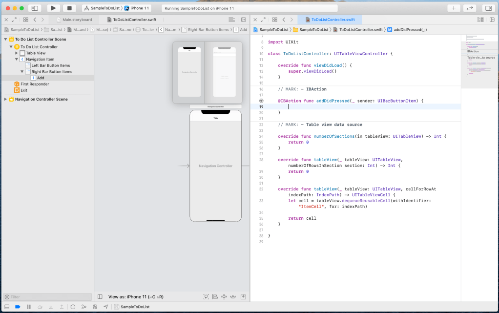 Now connect the UIBarButtonItem to an action with the name addDidPressed in the ToDoListController class.