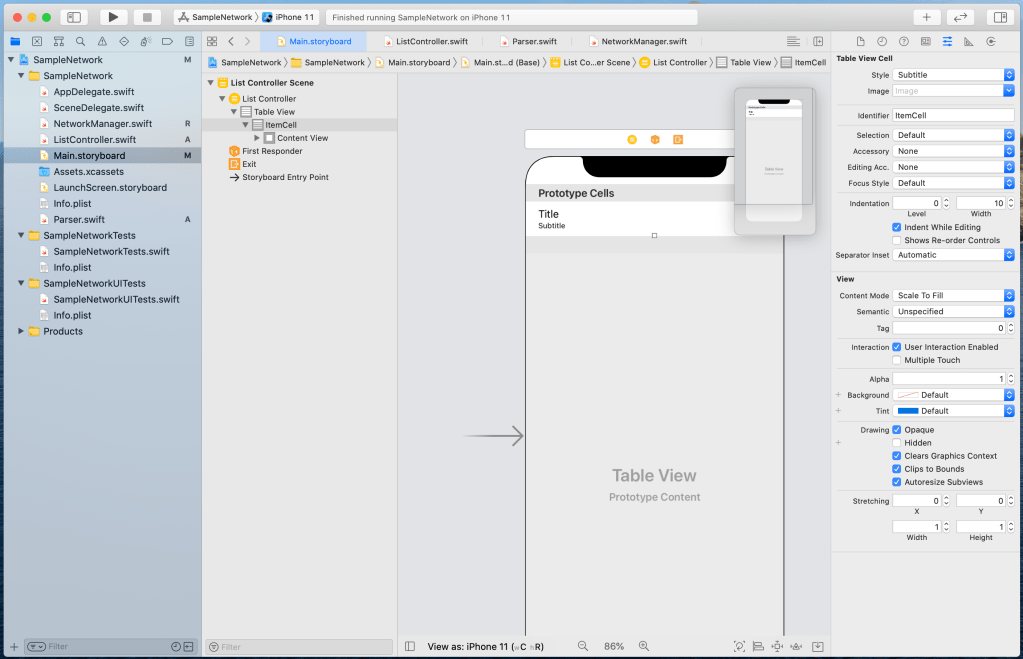 We will create a simple app where we will be fetching some data from a given url and eventually display them in a UITableView. Create an Xcode project and name it SampleNetwork. Follow the tutorial iOS – UITableView to add a UITableViewController in the Main.storyboard and to make it the initial view controller. Create a subclass of UITableViewController and name it ListController. Make sure the UITableViewController in your Main.storyboard takes your ListController as class and name your prototype cell to ItemCell and change its style to Subtitle.