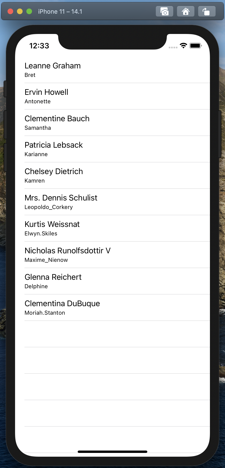 Run the project. If the user list has been successfully fetched from the server, you should have them displayed in your app as shown below.
