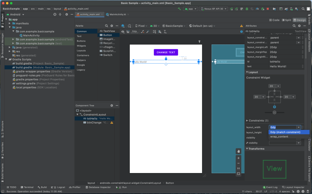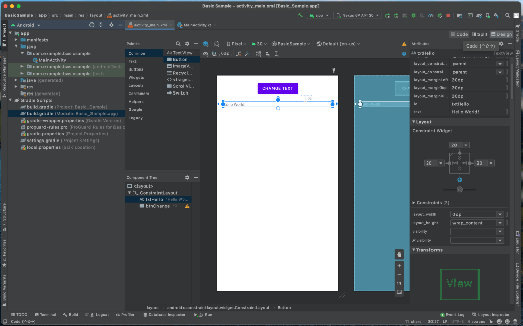 Let’s define an action method btnChangeDidPressed() for our Button so that when it’s clicked our TextView‘s text changes to You pressed the button. Copy the following method btnChangeDidPressed() in your MainActivity.kt class file.