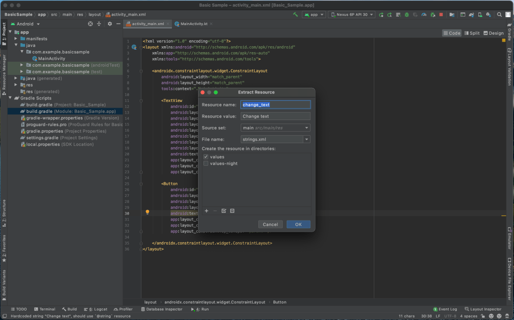 In the code view of our activity_main.xml file, select the text Change text and keep hovering on it till you see a popup as below. Then click on Extract string resource.